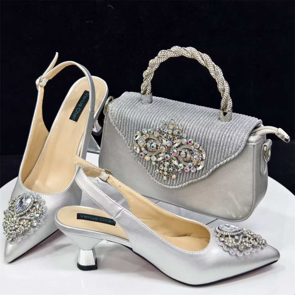 Women’s Shoes And Bags Handmade Flower Decoration High Temperature Rhinestone Satin High Heels Suit