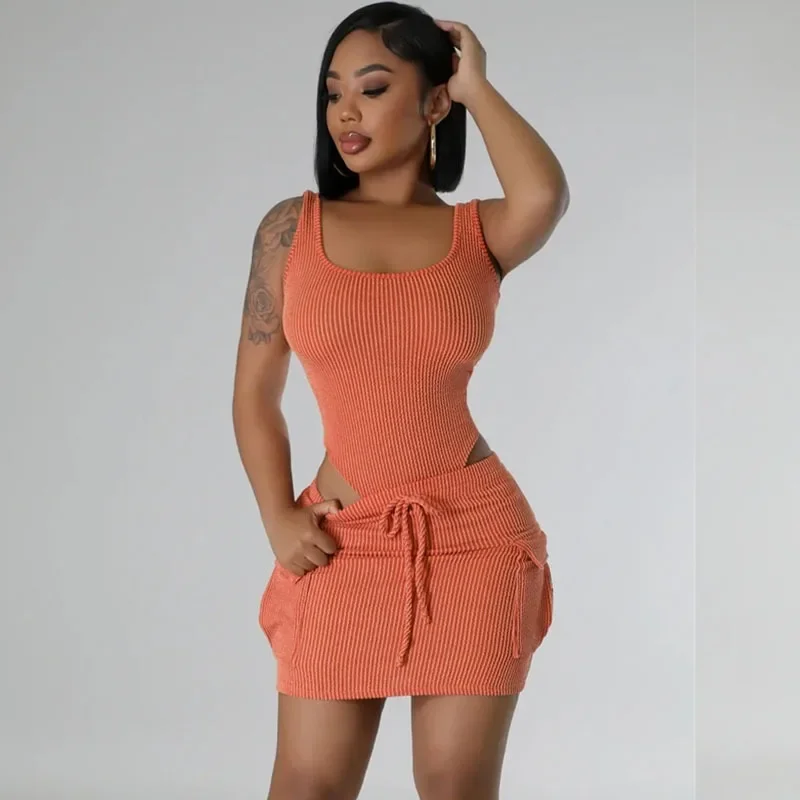 Knitted Ribbed 2 Piece Summer Sets Outfits Women Clothing Sporty Tank Bodysuit Top and Mini Skirt with Pockets Matching Sets