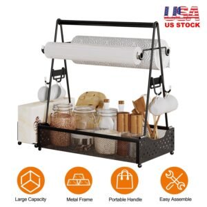 *Large Capacity*:Composed of 2 paper towel holders,2 small side hanging hooks,1 side hanging basket and 4 compartments,our utensil caddy is designed to store different types of items. You can easily put all your kitchen and barbecue accessories all together in this large and economical grill caddy.