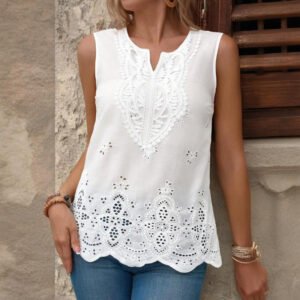 Add delicate charm to your wardrobe with our  Embroidered Eyelet Blouse ! This  sleeveless top  features a  flattering notched neckline  and  intricate lace trim , blending  feminine embroidery  with  breathable eyelet detailing  for a romantic yet casual look. Perfect for warm weather, this  lightweight blouse  keeps you cool while making a stylish statement.
