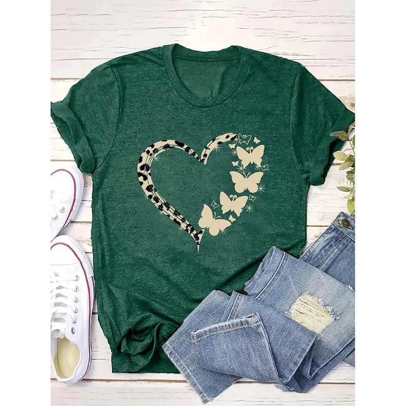 Women Cute Heart Graphic Shirt Summer Butterfly T-Shirt Short Sleeve Top Tees